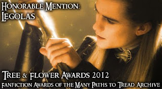 I am sending out a huge "Thank You" to the organizers of the 2012 Tree and Flower Awards held on MPTT. I was thrilled to have several stories of mine win either Third Place or Honorable Mention and doubly thrilled to have my artwork "And Maedhros Stood Aside" awarded First Place! Here are the stories and links to where everything can be read or viewed on MPTT for those of my friends who may be interested.
