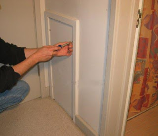 We put together a luan panel with a nice frame around it, and packed the car with tools, a workbench, more tools, the panel and frame, and more tools. Off we went to save the day. We arrived shortly after Noon and started work. We roughed the wall to the dimensions we needed, added spacers for depth on the panel, mounted the framing to the panel, primed it a lovely white color (they will have to paint the hallway anyway, so now it's ready to be painted) and mounted it to the hole in the wall. Voila! No more hole in the wall! We also began patching some holes in the walls and some corners that had seen better times. We'll have to go back and work on those a couple more times as they are too deep to do in a single time. It was very successful, though.