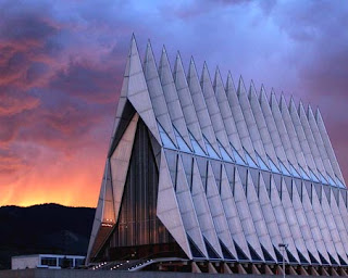 The background in this picture of the Air Force Academy chapel is sunset, but pictures taken now might show the